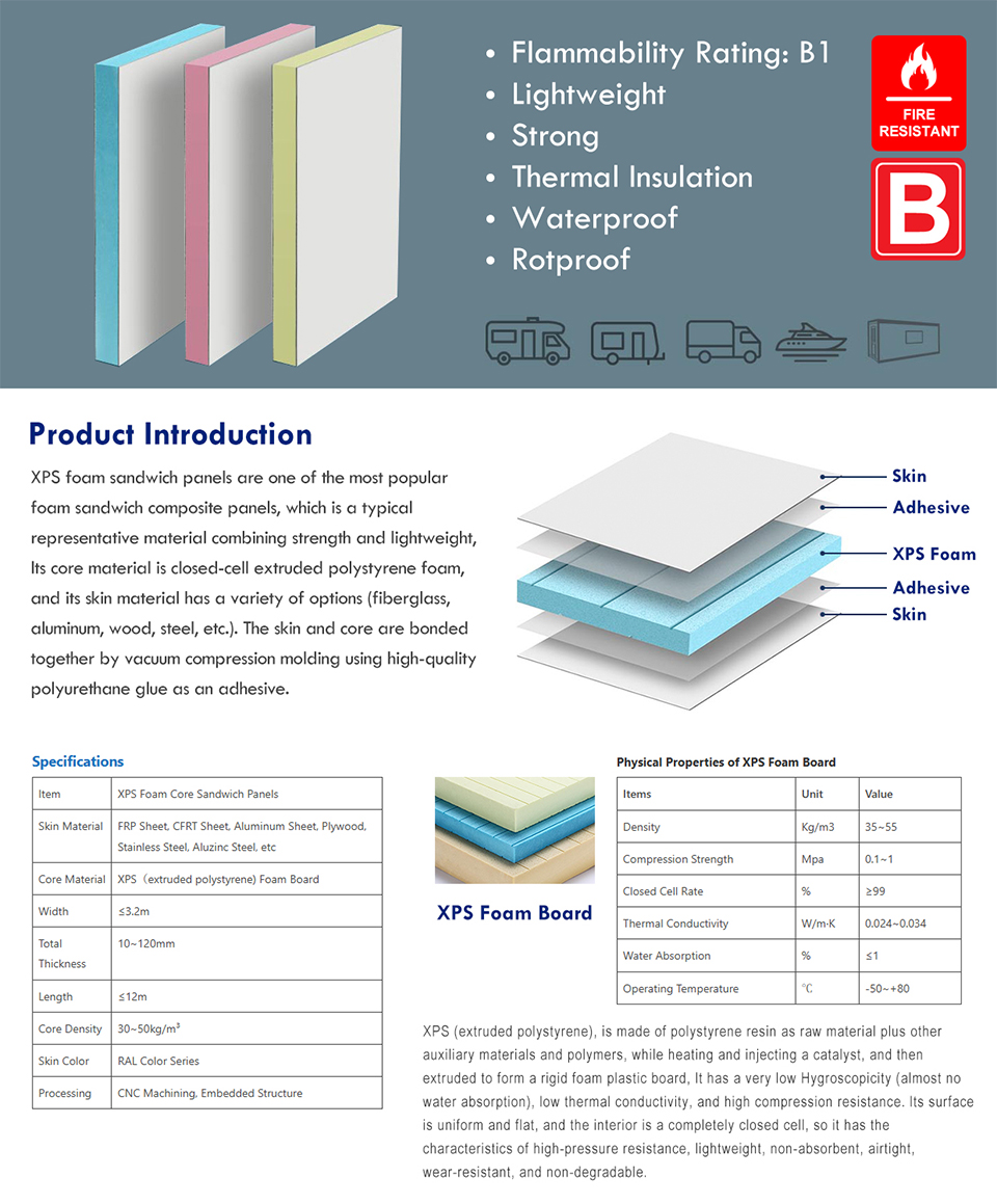 XPS Foam Core 50 kg/m³ is fully compatible with a wide range of composite facing materials, making it ideal for sandwich panel construction.